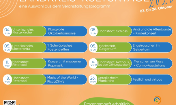 Die 24. Landkreis-Kulturtage finden mit mehr als 60 Veranstaltungen und zahlreichen Schullesungen vom 2. bis 26. Oktober 2025 statt. Auch in Höchstädt und in Unterliezheim werden tolle Veranstaltungen stattfinden. Alle Informationen und Buchungsmöglichkeiten finden Sie auf kulturundwir.de