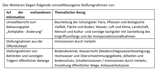 Bezüglich der umweltbezogenen Informationen nach § 3 Abs. 2 BauGB, wird darauf hingewiesen, dass für den Bebauungsplan ein Umweltbericht mit der Beurteilung der Schutzgüter Tiere, Pflanzen, Boden, Fläche, Wasser, Klima, Luft, Landschaftsbild, Erholung, Mensch und seine Gesundheit, Kultur- und Sachgüter erstellt wurde. Zusammenfassend ergibt sich daraus, dass bei Umsetzung des Bebauungsplanes „Kohlplatte – Änderung“ unter Berücksichtigung aller Maßnahmen zur Vermeidung, Minimierung und zum Ausgleich, es zu keiner erheblichen Beeinflussung dieser Schutzgüter kommt.