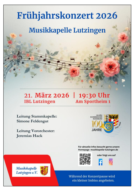 Am 21. März um 19:30 Uhr wird die Musikkapelle Lutzingen e. V. ihr alljährliches Frühjahrskonzert im Interkommunalen Bürger- und Kulturzentrum "Zum IBL" am Sportheim 1 in 89440 Lutzingen geben. Die Musikkapelle hat ein abwechslungsreiches Programm vorbereitet, welches sowohl klassische Blasmusik als auch moderne Klänge beinhaltet.