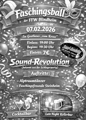 Der Faschingsball der FFW Blindheim findet am 07. Februar im Gasthaus "Zum Kreuz" um 19:30 Uhr statt.