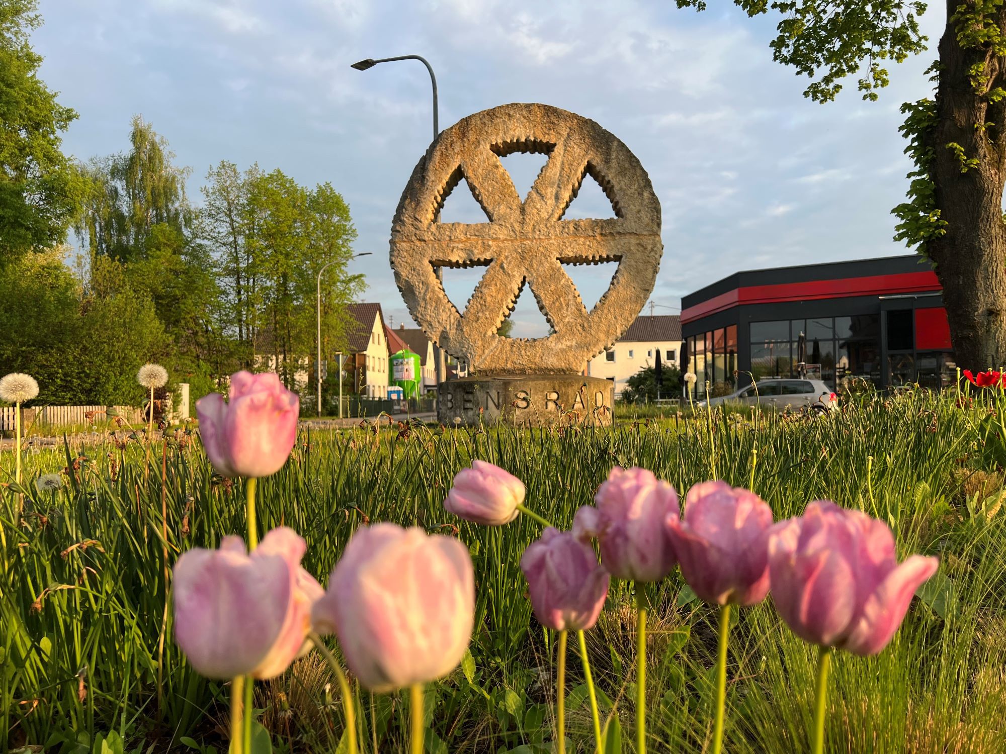 Das drei Meter hohe Rad aus Jurakalkstein erinnert an die Mühlen entlang des Klosterbachs. Gestiftet von Bürgern und Firmen, schuf Herbert Wurm 2007 dieses archaische Werk, das auch die Bedeutung des Lebensrades symbolisiert.