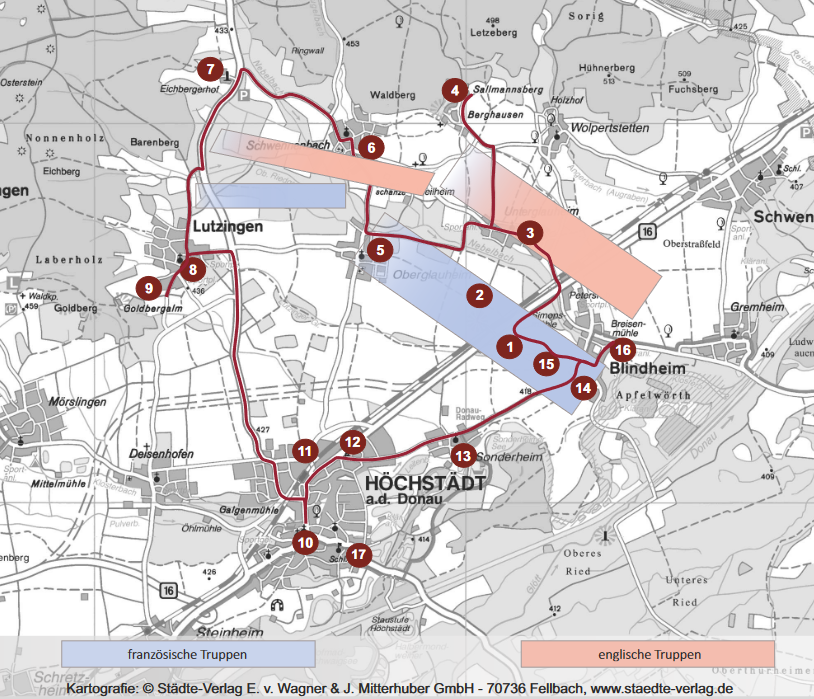Der Rundweg mit etwas 23 km Streckenverlauf ist anlässlich des Gedenkjahres 2004 im Zusammenwirken der Stadt Höchstädt mit den Gemeinden Blindheim und Lutzingen entstanden.
