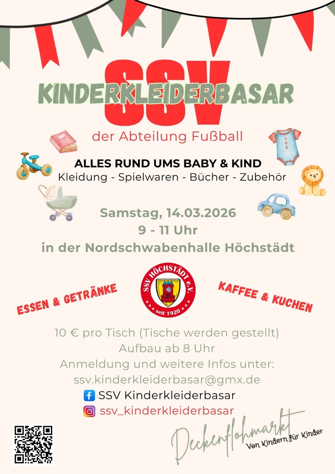 Der SSV Kinderkleiderbasar der Abteilung Fußball findet am Samstag, den 14. März von 9-11 Uhr in der Nordschwabenhalle Höchstädt statt.