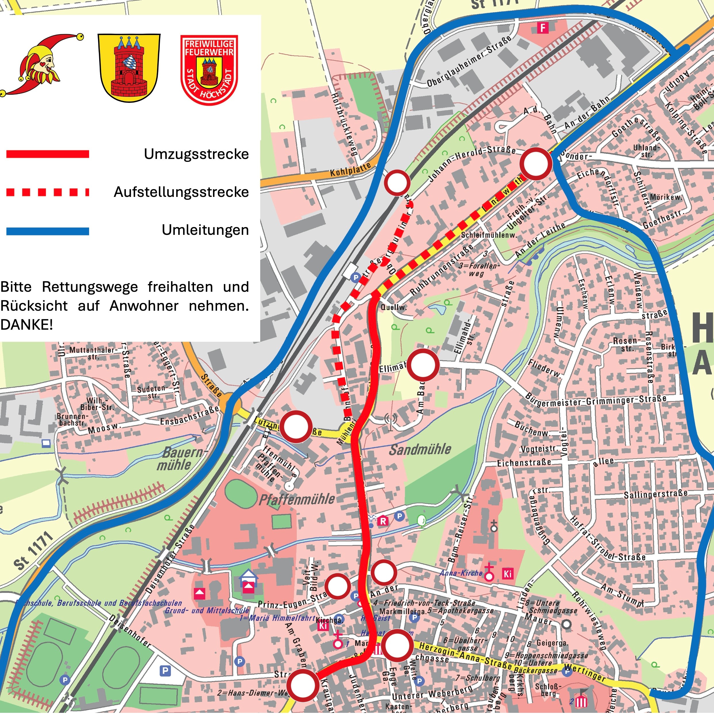 Bitte nutzen Sie zum Parken die üblichen Parkflächen im Stadtgebiet. Da auch während des Umzugs jede Straße durch die Feuerwehr Höchstädt und den Rettungsdienst erreichbar sein muss, halten Sie sich bitte unbedingt an die ausgeschilderten Park- und Halteverbote. Nehmen Sie auch Rücksicht auf den fließenden Verkehr. Vielen Dank! 🙏