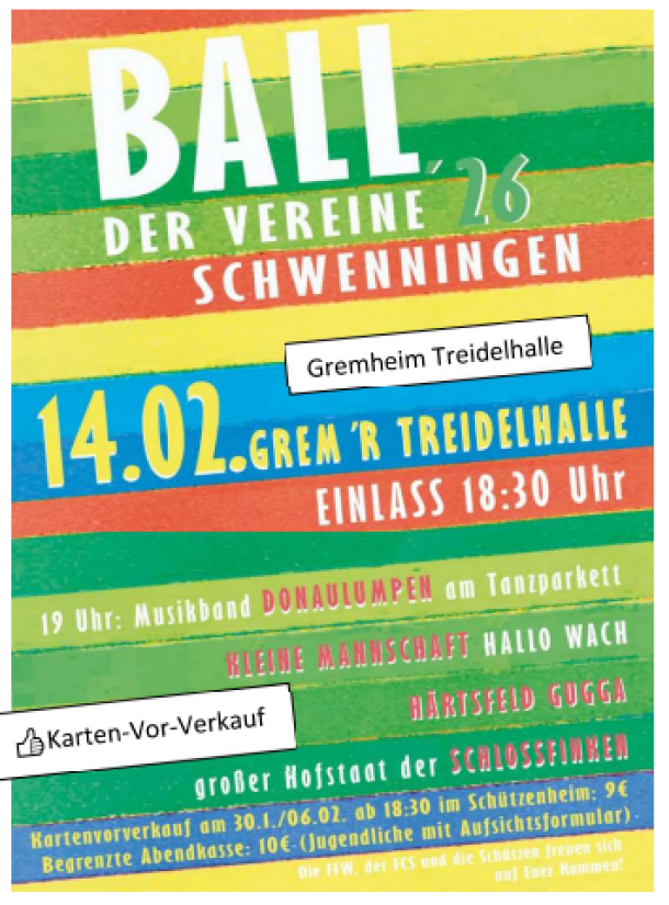 Am Dienstag, den 20. Januar 2026 finden sämtliche Wahlausschusssitzungen der Gemeinden und der Stadt Höchstädt zur Beschlussfassung über die eingereichten Wahlvorschläge statt. Die Sitzung findet statt  für die Gemeinde Blindheim um 15:00 Uhr für die Gemeinde Finningen um 16:00 Uhr für die Gemeinde Lutzingen um 17:00 Uhr für die Gemeinde Schwenningen um 18:00 Uhr und für die Stadt Höchstäd…