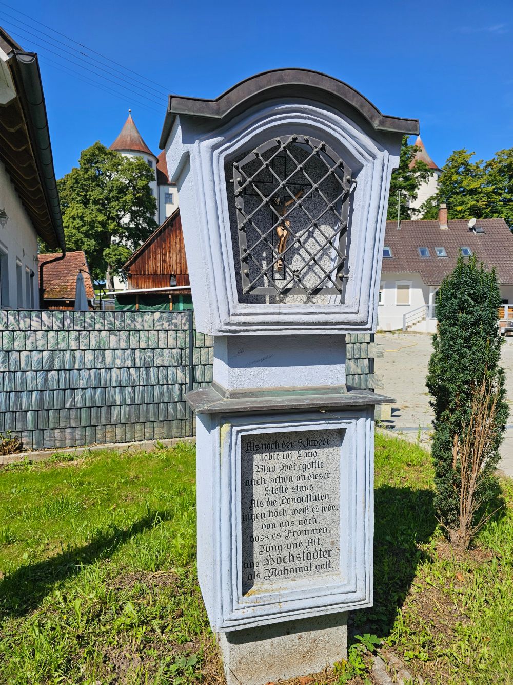 Ein schlichtes Holzkreuz erinnert an das Hochwasser von 1784 und zeigt mit blauen Wellen den damaligen Wasserstand.