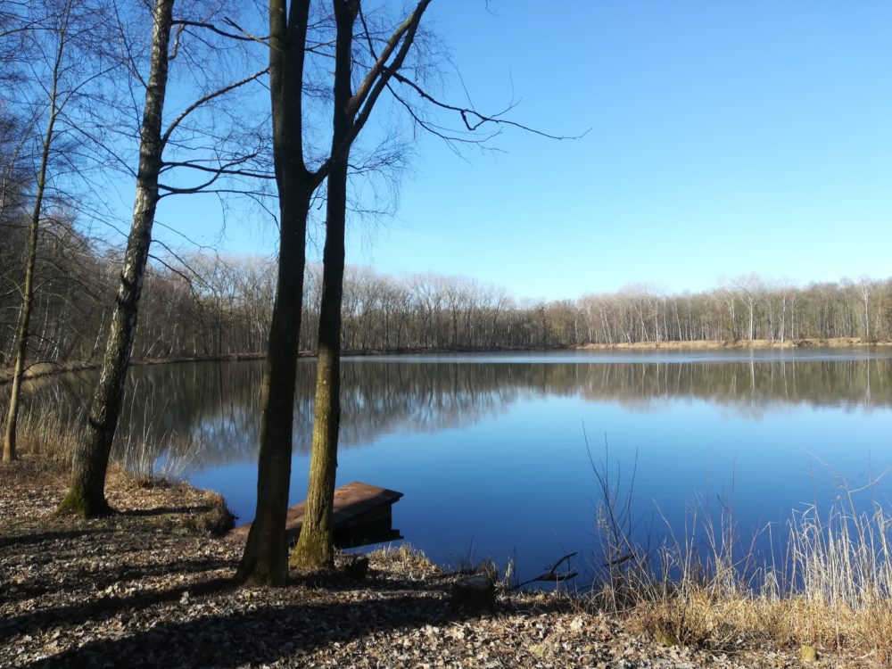 Der Blick nach oben durch dicke alte Eichen und Laubwälder eröffnet einem ein urwaldartiges Gefühl. Genießen Sie die Stille und zugleich die Kraft des Waldes. Die Seenlandschaft entlang des Weges ist durch die Kiesgewinnung entstanden, aber vielerorts bereits von Schlingpflanzen und Seerosen zurückerobert worden.